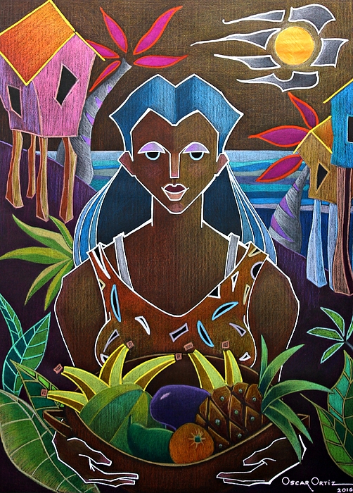 A woman with blue hair holds a vibrant basket of fruits, surrounded by colorful stilt houses against a tropical landscape. The scene is set under a... more